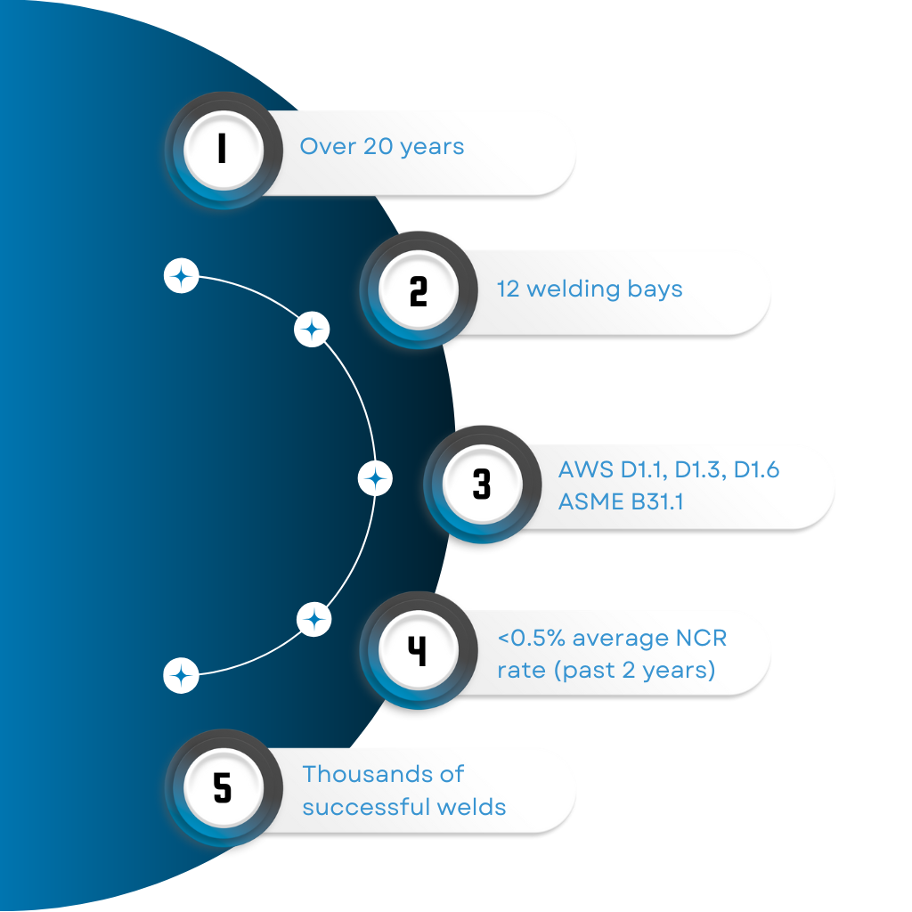 AWS/ASME‑credentialed welders follow defined WPS/PQR and inspection checkpoints to minimize NCRs and rework.